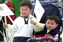 弟十六日隨家長參加慶祝回歸一周年的活動時,揮舞支持北京申辦奧運會的小旗。中新社傳真 宗金柱攝