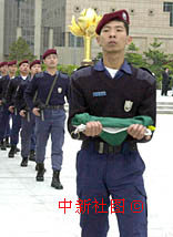 澳門警察手捧區旗在蓮花廣場彩排。澳門特區政府將于十二月二十日舉行盛大的升旗儀式,以慶祝回歸祖國一周年,圖為當地警察十五日手捧區旗在蓮花廣場彩排。中新社傳真宗金柱攝