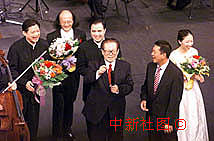 江澤民主席與何厚鏵、陳?ài)脐?yáng)、孔祥東、莫華倫、林盈盈以及全場(chǎng)觀(guān)眾,齊唱《歌唱祖國(guó)》。中新社傳真 滿(mǎn)會(huì)喬 攝