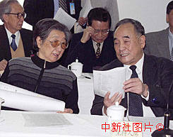 全國政協(xié)副主席錢正英(左)九日參加關(guān)于“西電東送”提案討論會時說,“西電東送”具有戰(zhàn)略意義。作者:關(guān)向東