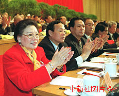 全國政協(xié)常委、香港中華總商會(huì)副會(huì)長張永珍(左一)十一日在全國政協(xié)九屆三次會(huì)議閉幕大會(huì)主席臺(tái)上。作者:宗金柱