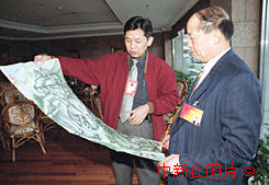 八十高齡的北京宮廷畫(huà)派代表人吉文旭(滿(mǎn)族),十二日委托工作人員向出席九屆全國(guó)人大三次會(huì)議的全國(guó)人大常委梁廣大(右)贈(zèng)送國(guó)畫(huà)。作者:陳勇