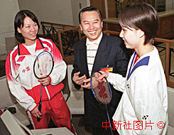 全國人大廣東代表、羽毛球國家級教練傅漢洵(中)十二日在住處熱忱接待他的兩個得意門生、中國羽毛球隊運動員謝杏芳和張潔雯,并對她們傳授球藝。傅漢洵是世界羽毛球雙打冠軍關渭貞、吳迪西、林雁芳、勞玉晶的教練。作者:陳勇
