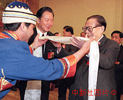 國家主席江澤民十三日到全國人大甘肅省代表團參加討論時,接受少數民族獻上的哈達。作者:宗金柱