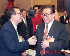 江澤民主席十四日到九屆全國人大三次會議北京代表團參加討論,與科技界著名人士王選交談。中新社記者 李剛 攝