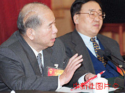 中共中央政治局常委尉健行(左)四日在參加全國政協工會界小組會議時說:工會在新時期要加強給特困職工的“送溫暖”工作。 作者:羅仰明