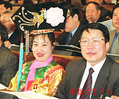 來自遼寧省的人大代表祈雅民(滿族)穿戴民族節日盛裝出席九屆全國人大三次會議開幕大會。作者:李剛