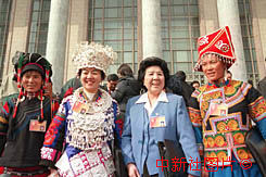 全國人大常委萬紹芬(右二)和貴州的少數民族代表,五日出席九屆全國人大三次會議。作者:羅仰明