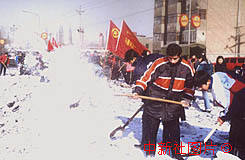 新疆生產建設兵團的數萬名青年志愿者,3月5日在“青年志愿者行動日”學習雷鋒,開展多種形式的社區服務活動,為社會民眾服務。圖為青年志愿者在清掃烏魯木齊的積雪,美化市容。作者:閆文陸