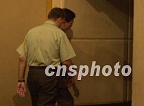 美國駐華使館武官席樂高準將十一日晚十時四十分在海口文華大酒店新聞發布會上說,現在還不能公布一個機組人員離境的時間表,然后匆匆忙忙從后門離開。中新社記者 賈國榮 攝