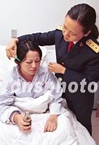 英雄飛行員王偉犧牲后,他的妻子阮國琴一直沉浸在巨大悲痛之中,茶飯不思,每天需服用藥物才能入睡。圖為四月十八日上午,工作人員在北京某醫院護理身體虛弱的阮國琴。中新社圖 張全躍 攝