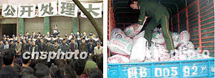新聞組圖:中國各地嚴打行動 2001年4月25日 10:04 ![]() 圖(1) 圖(2) ![]() 圖(3) 圖(4) ![]() 圖(5) 圖(6) 圖(1)說明:北京西城公安分局、工商局日前聯合在夜間清理音像市場,當場抓獲販賣盜版光盤人員十余名。中新社記者宋吉河攝 圖(2)說明:北京公安西城公安分局日前夜間收容外地進京“三無”人員,全面整頓社會治安。中新社記者宋吉河攝 圖(3)說明:重慶市巴南區二十四日在電影院廣場前公開審判十九名刑事犯罪分子,上千名當地群眾參加了大會,無不拍手稱快。中新社記者趙振清攝 圖(4)說明:福清市公安邊防大隊官兵,23日凌晨在“治爆緝槍專項行動”中,先后破獲二起特大偷運、私藏炸藥案,共查獲土制銨油炸藥5000多公斤、雷管283枚、導火索250米。圖為一名邊防警員在福清海口鎮方新村官下尾路段攔檢一輛裝載有土制銨油炸藥的可疑貨車。中新社圖賀錕陳暉攝 圖(5)說明:中國重慶市巴南區二十四日在該區電影院廣場前公開審判十九名刑事犯罪分子,當地上千名市民圍觀犯罪分子被押上刑車,送往監獄的過程。中新社記者趙振清攝 圖(6)說明:中國重慶市巴南區二十四日在該區影院廣場公開審判十九名刑事犯罪分子,當地千名市民現場目睹犯罪分子被押上刑車,送往監獄的過程。中新社記者趙振清攝 |