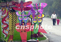 北京園林商店備好多姿多彩的風箏,為五月歡度七天長假的游客準備乘風放飛。中新社記者 賈國榮 攝