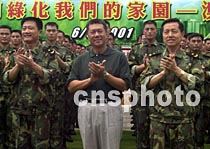 中國人民解放軍駐澳部隊六日首次參與當地植樹活動,圖為特區政府行政長官何厚鏵與駐澳部隊司令員劉粵軍(左)、政委劉良凱及參與植樹活動的二百名士兵合影留念。中新社記者 宗金柱 攝