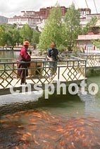 西藏拉薩市布達拉宮下的廣場水池中放養了許多錦鯉,形成世界屋脊觀魚的新景觀。中新社記者 趙振清 攝