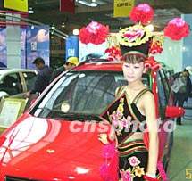 正在昆明舉行的五月“世博2001”汽車品牌展示會上,唯一身著少數民族服飾的模特令人耳目一新。中新社記者 納家驊 攝