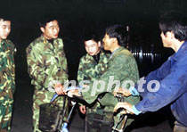 浙江省玉環縣的巡邏隊員夜間在刑事案件多發地段巡查。這支在“嚴打”中協助警方治理社會治安的夜巡隊伍,已抓獲犯罪嫌疑人六百五十六名,協助警方破案一百五十四起。中新社圖 於建偉 攝