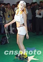 正在北京舉行的2001中國國際體育用品博覽會上,各參展商在展臺上推出商品展示。圖為曼奴服飾集團展位上身穿運動服的外國模特。中新社記者 錢興強 攝