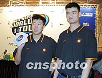 一場原汁原味的NBA比賽將于九月十六日首次在上海舉行。這場名為NBA NIKE星光大賽對賽的陣容是由NBA球星以及中國當(dāng)?shù)刈罴亚騿T混合組成。圖為王治郅、姚明在上海表示要盡力打好比賽。中新社記者 潘索菲 攝
