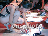 在青島舉行的戴安娜2001世界精英模特大賽中國預選賽暨金沙灘模特大賽,日前舉行參賽選手自行設計剪裁服裝比賽。圖為參賽選手全神貫注的進行創意剪裁。中新社記者 錢興強 攝