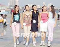 山東省青島市繁華的文化廣場上,幾名身穿休閑裝的模特興高采烈地談笑游玩。中新社記者 錢興強 攝
