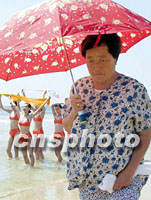 日前,在青島參加戴安娜2001世界精英模特大賽中國預(yù)選賽的模特選手,來到風(fēng)景秀麗的金沙灘景區(qū)拍攝。圖為一位沙灘漫步的打傘老人匆匆從身穿泳裝模特身邊走過。中新社記者 錢興強(qiáng) 攝
