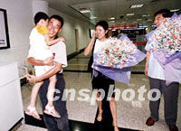 24日上午,在菲律賓南部脫險的中國公民王勝利乘班機離開馬尼拉,于上午11時抵達廈門國際機場與妻女相聚。中新社圖 鄭憲 徐萬 攝