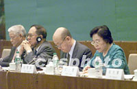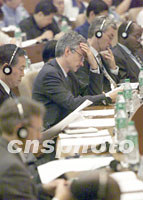 “21世紀論壇-綠色與環保2001年會議”四日在北京開幕,與會外國學者認真聽取會議發言。中新社記者 滿會喬 攝