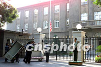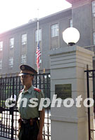美國駐中國大使館十二日清晨降半旗,對在美國紐約與華盛頓恐怖事件中的罹難者表示哀悼。中新社記者 毛建軍 攝