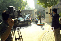 美國十一日遭到連續恐怖襲擊后,12日清晨,美國駐華使館對進入的車輛加強安全檢查,新聞媒體特派記者在門前跟蹤采訪。中新社記者 史利 攝