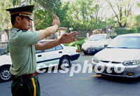 因美國遭受襲擊事件,12日晨,美國駐華大使館前的馬路開始施行交通管制,武警士兵禁止機動車與行人通過。中新社記者 史利 攝