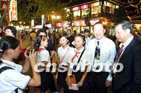 第六屆華商大會代表十七日晚游覽南京著名風景區夫子廟,南京的少先隊員好奇地與代表們攀談并合影。中新社記者 李剛 攝
