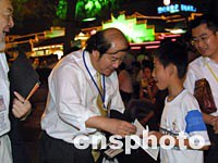 出席華商會的美國美中經貿促進會會長貝聿愷十七日晚在南京著名景區秦淮河畔游覽時,為熱情的南京小市民簽名。中新社記者 鄭萍萍 攝