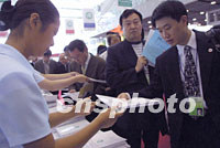 第六屆世界華商大會“中國經濟論壇”即將開幕,中國外經貿部長石廣生等將在會上演講,代表們入場前爭先領取發言稿。中新社記者 鄭萍萍 攝