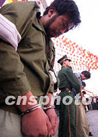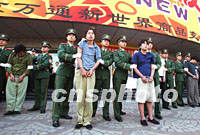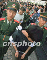 袁存敏等七名盜竊、搶劫犯罪嫌疑人,二十日在北京萬通商場前,被西城公安局公開逮捕。警方在人員密集地段進行公開宣判,以威懾犯罪分子、增強市民防范意識。中新社記者 宋吉河 攝