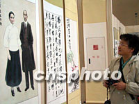紀念辛亥革命九十周年書畫展在北京中國革命博物館舉行,一位參觀者駐足中山先生夫婦畫像前,瞻仰他們當年的豐采。中新社圖 武仲林 攝