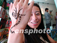 一位北京小姐周末到尚吉體繪店請(qǐng)人在她手背繪上毒蝎圖案,據(jù)店員介紹這種毒蝎標(biāo)志在京城時(shí)尚美女中頗為流行。中新社圖 陳峰 攝