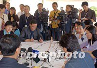 第四屆WTO部長會議十三日晚將在卡塔爾首都多哈落下帷幕,中國代表團在閉幕前召開記者吹風會。圖為來自中國大陸、港澳臺的記者一同采訪中國官員。中新社記者 錢興強 攝