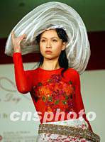 香港理工大學設計學院的應屆畢業生周日展示他們設計的各式時裝,其中一款繡花緊身紅上衣配帶歐式大帽賦予女性獨特韻味。中新社傳真 任晨鳴 攝