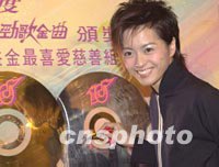 無線電視「2001年度十大勁歌金曲頒獎典禮」10日在香港舉行記者會,眾多歌星均出席盛會,歌星梁詠琪在大型CD上簽名。頒獎禮將于明年1月13日晚假紅館舉行,門票收益將撥捐公益金作慈善用。中新社傳真 鄧慶樂 攝