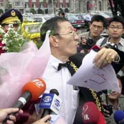 圖文:一討債公司老板向呂秀蓮求婚遭警方攔下 2001年12月11日 13:51 ![]() 呂秀蓮(資料圖片) ![]() 董念臺11日捧著99朵紅玫瑰,率領48輛豪華禮車,浩浩蕩蕩去向心儀許久的呂秀蓮求婚,但遭警方攔下。董念臺說不能阻止他求婚的意志。(張良一攝) 中新網(wǎng)香港12月11日消息:臺北訊,臺灣一討債公司負責人董念臺今天上午演出向呂秀蓮“求婚記”,不過求婚車隊在途中即遭到臺北市警察局攔下,董念臺在不滿下憤而離去。 據(jù)“中央社”報道,對于今天的求婚之舉,董念臺稱,他欣賞呂秀蓮憨直、有話直說的個性,他認為呂是位優(yōu)秀的女性。 上午九時許,由十二輛奔馳、十二輛卡迪拉克高級轎車組成的車隊從臺北市中正紀念堂出發(fā),浩浩蕩蕩準備到“總統(tǒng)府”“求婚”。 車隊在抵達“總統(tǒng)府”前的貴陽路遭轄區(qū)員警攔下,董念臺穿著燕尾服,手上拿著九十九朵玫瑰和一封求婚信件,他不滿指出,他與呂秀蓮男女未婚,答應求婚與否固然是女方的權利,但求婚也是他的自由,這是人民應有的民主法治。 董念臺說,如果說他妨礙交通,事前他已去函臺北市警局,但警方并未制止,現(xiàn)在又說他違反“集會游行法”,他認為是警方違法在先。 稍后,董念臺認為既然高攀不起,憤而將玫瑰花扔在地上后離去。 相關報道:真情?搞笑?臺灣一討債公司老板向呂秀蓮求婚 |