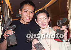 剛剛榮獲第三十八屆臺灣電影金馬獎影帝、影后的大陸演員劉燁(左)、秦海潞十三日向北京媒體展示獎杯,他們因在《藍宇》、《榴蓮飄飄》兩部電影中分別飾演男、女主角而獲此殊榮。 中新社圖 武仲林 攝