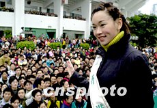 二十日,十九位華裔佳麗在廣州參加“花車大巡游、靚麗新廣州”大型巡游活動。圖為代表香港角逐二零零二年度國際華裔小姐的香港小姐楊思琦在花車上向廣州市民展示美姿。中新社記者 梁永強 攝