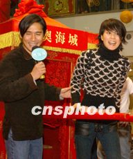 由香港大導演王家衛監制的電影《天下無雙》2月3日在香港奧海城舉行盛大推介會,香港新“影帝”梁朝偉親自迎接在劇中出演女主角的“歌后”王菲下花轎。中新社傳真 任晨鳴 攝