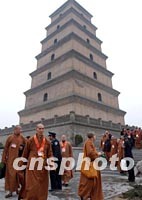 在西安參加法門寺佛指舍利赴臺灣地區瞻禮(供奉)活動的兩岸佛教人士,二十二日上午來到西安大雁塔參觀。中新社記者 錢興強 攝