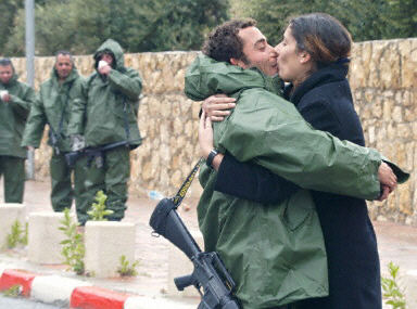在耶路撒冷市和西岸城市伯利恒之間地一處檢查站,一名以色列士兵與女友相擁而吻。以軍進入了古城伯利恒,并向教堂開火,一名神父被殺,另外六名修女受傷。法新圖