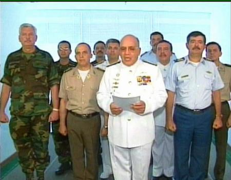 ![]() 當(dāng)?shù)貢r(shí)間4月11日,委內(nèi)瑞拉海軍參謀長(zhǎng)拉米雷茲-佩雷斯(前方著白衣者)代表30名軍官通過錄像帶宣布,不承認(rèn)查韋斯總統(tǒng)。
