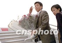 痛失愛妻的丁先生十九日下午手捧鮮紅的玫瑰,和其他八十二名四·一五空難死傷者家屬一起乘包機飛往韓國。中新社圖 鄭萍萍 攝