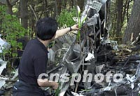 “四·一五”空難中國死難者的家屬21日在事故現場憑吊親人。圖為一死難者家屬在失事飛機的殘骸上插花悼念亡者。中新社記者 陶光雄 攝