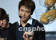中國首席男模胡兵,十一日在北京國際展覽中心“2002萊卡風尚之城”的風尚廚房里,為前來參觀的賓客展示廚藝。作者:東方